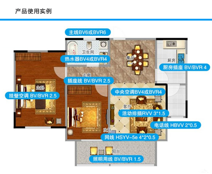 本產(chǎn)品適用于交流額定電壓450/750V及以下的動力裝置的固定敷設。如家裝照明。固定布線可用于室內(nèi)明敷、穿管等場合。為了方便在安裝過程中的區(qū)別,可分為紅、黃、藍、綠、黑、白、雙共七種顏色。由于BVR是軟結(jié)構(gòu)的,運用范圍也多在軟環(huán)境下。