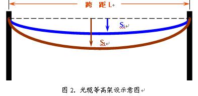 當(dāng)光纜的氣象條件確定后,可以按照客戶要求的跨距和芯數(shù)進行設(shè)計了.ADSS光纜有等高和不等高架設(shè)兩種方式,圖2為等高架設(shè)時光纜的懸掛情況.